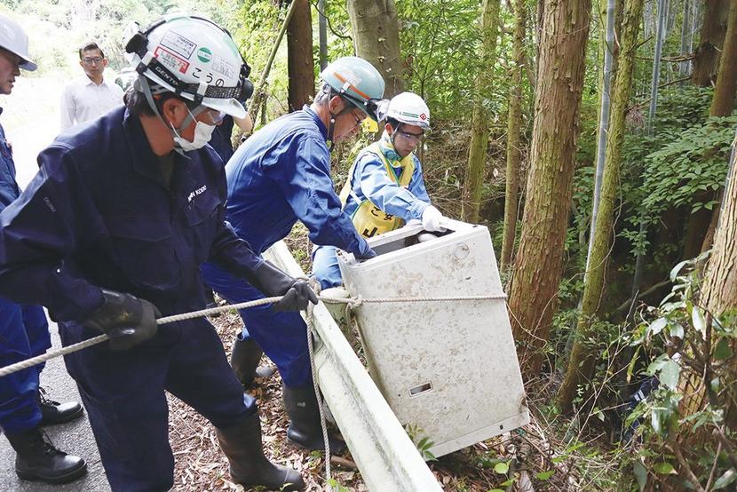 不法投棄は夜間に車で廃棄物を運んで、高い所から投げ捨てる事例が多い。ヘルメット、長靴、手袋を着用し作業服を着た参加者は、市道脇の斜面に捨てられたゴミのタイヤや洗濯機、冷蔵庫などを直接ロープでしばって引き上げた。