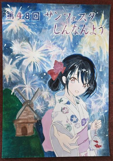 周南市の新南陽地区最大の夏祭り、第48回サンフェスタしんなんようのポスター、チラシの審査会が開かれ、ポスターの図柄は中学校の部で特選に選ばれた福川中2年、赤木...