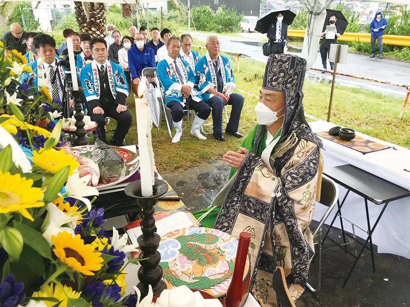 山口県周南市粭島にあるふくモニュメントの前で1日、ふく魚介類供養祭が開かれ、飲食店関係者、市議ら約30人が参列した。 この供養祭はふくはえ縄漁法発祥の地であ...