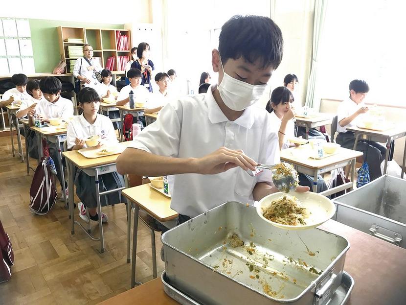 山口県周南市の岐陽中1年生、板野りりぃさん(12)が昨年考案した「合ひき肉とピーマンの春雨炒め」が2日、市内の小中学校4校の給食で提供され、児童、生徒ら約1,...