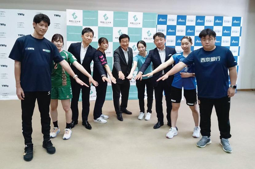 「しゅうなん・スポーツコミュニティ・プロジェクト」と題した9月からの事業では、両チームによる市内中学生の指導教室に同大生が参加する。9月14日(土)に徳山駅前図書館で3者合同のトークイベント、11月16日(土)には湯野小学校でバドミントン、ハンドボール体験会を開くこととしている。