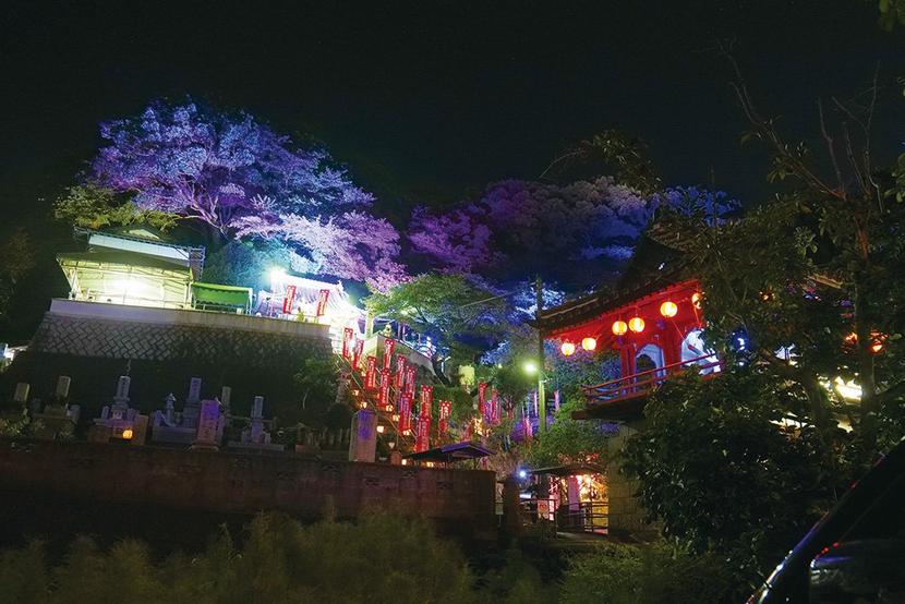 周南市川崎の国道2号沿いにある川崎観音堂で9日、毎年この日に開かれている年中行事「夜観音」に合わせて、本堂などがライトアップされた。 富田東地区まちづくり協...