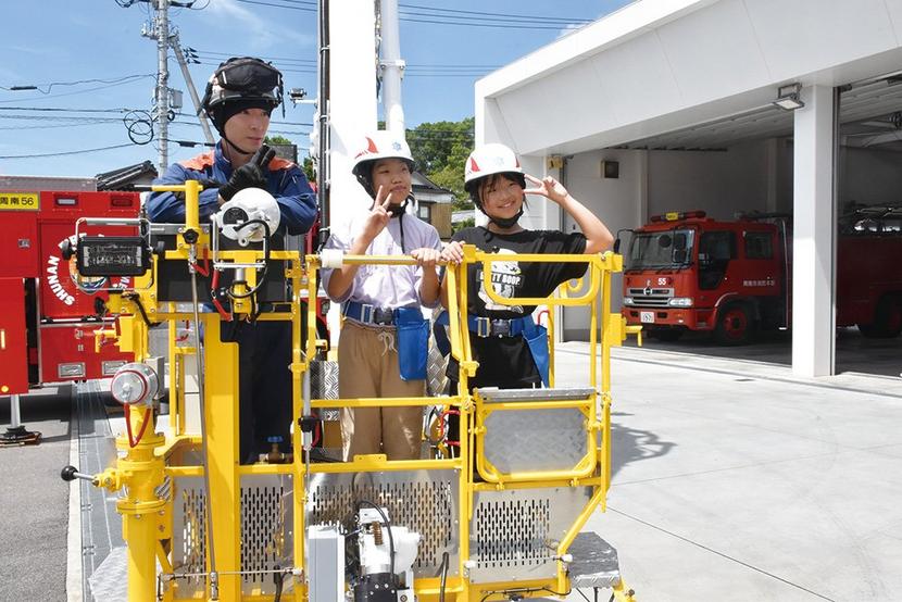 • 高所放水車に乗る子どもたち