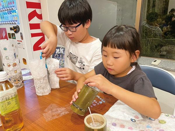 周南市湯野の国民宿舎湯野荘跡に今年4月にオープンした湯や晴ル音(はるね)で7日、周南公立大の学生が竹灯籠を使用したキャンドル作りのワークショップを開き、親子連...