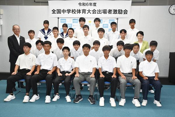 全国中学校体育大会に出場する岐陽中男子ハンドボール部やソフトテニス男子の周南クラブ、個人を合わせて7競技の延べ34選手の市長激励会が13日、周南市役所で開かれ...