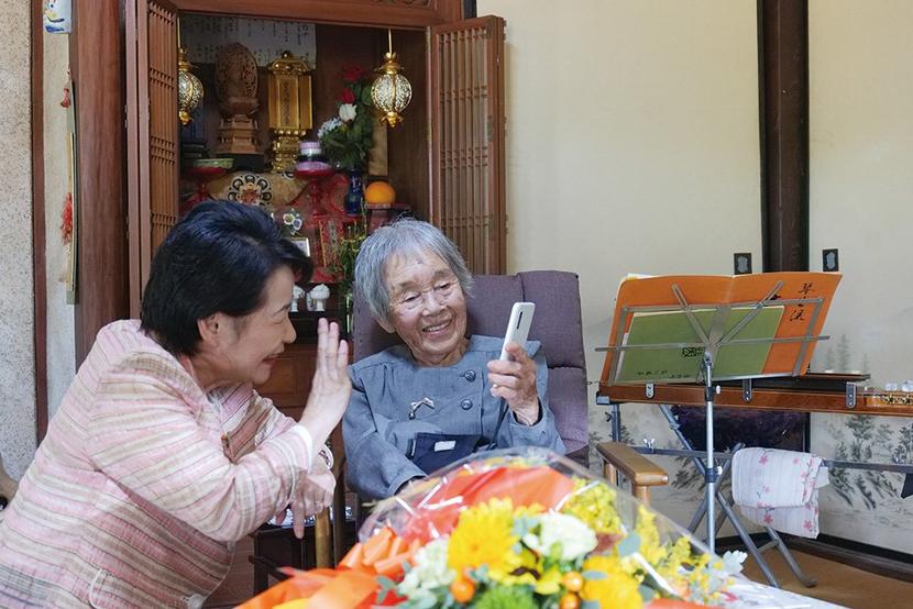 テレビ電話する滋子さんと藤井市長