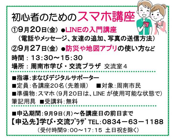 【周南】初心者のためのスマホ講座 20、27日・学び交流プラザ