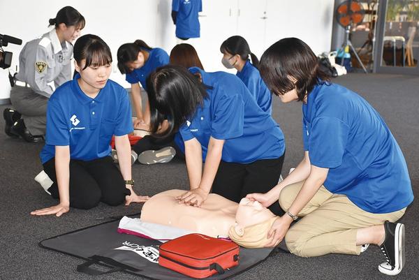 周南市消防本部の「救急の日」のイベントが7日、山口県周南市の徳山駅前図書館で開かれ、周南公立大の看護学科の1年生が救命入門コースで胸骨圧迫(心臓マッサージ)や...