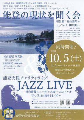 周南市金峰の須金フルーツランド内にある「かいたファーム」は10月5日(土)午前10時半から「能登の現状を聞く会」を開く。午後2時からは同所でJAZZライブ「能...