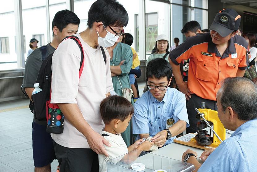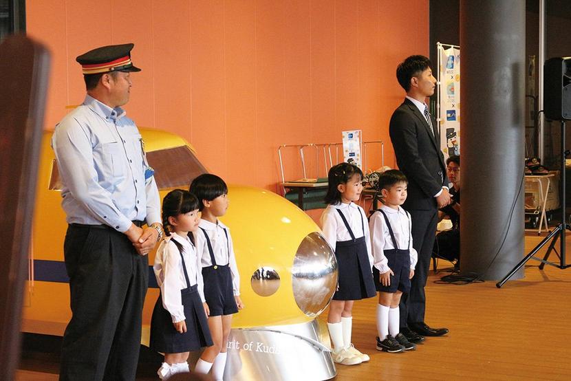 左から西嶋駅長、河原幼稚園の園児たちと稗田第一工場工場長
