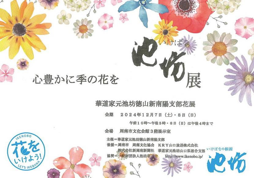 華道家元池坊徳山新南陽支部花展(新周南新聞社など後援)が12月7日(土)、8日(日)に周南市文化会館3階展示室で「心豊かに季(とき)の花を」をテーマに開かれる...
