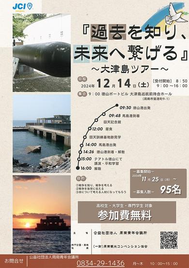 周南市大津島の回天記念館を訪れて戦争や日本の歴史を直接感じ、戦争の悲惨さや命について考える「過去を知り、未来へ繋げる〜大津島ツアー〜」が、14日(土)午前9時...