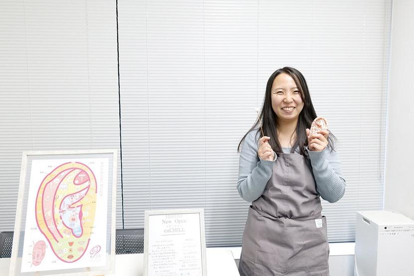 松尾代表は「耳には全身のツボがあり、座ったまま受けられる全身のマッサージです。心身ともに疲れているのに頼れるところがない人や、エステへ行くのは躊躇する人などにぜひ来ていただきたい。身近なセラピストになれたら」と望む。