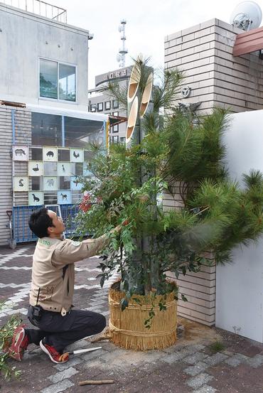 門松を立てる職員
