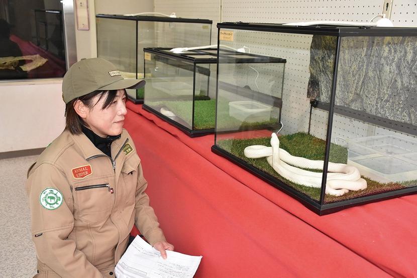 周南市の徳山動物園の展示館で18日から干支展「神か邪か蛇(じゃ)の道は蛇(へび)じゃ~」が始まった。ヘビの抜け殻は財布に入れておくと金運に恵まれると言われるこ...