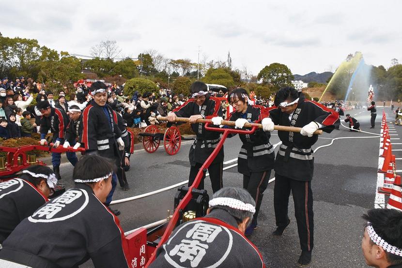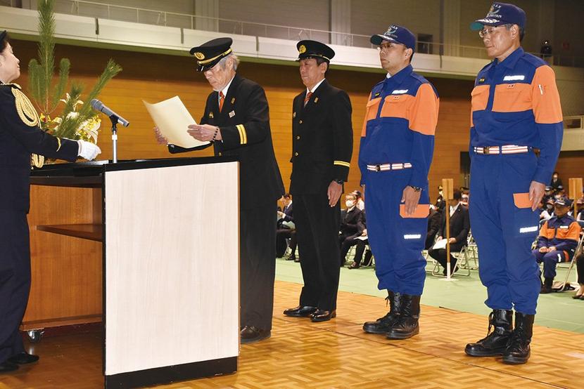 周南市消防出初式が5日、消防団などから約640人と、車両35台が参加してゼオンアリーナ周南の多目的ホールで式典と、周南緑地公園の駐車場で市消防本部による救助訓...