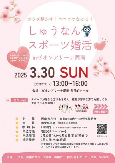 「しゅうなんスポーツ婚活inゼオンアリーナ周南」が3月30日(日)午後1時から4時まで、周南市の同館で開かれ、ソフトバレーボールやミニ運動会で交流する。 市...