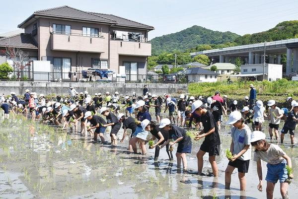 周南市の久米小(八木伸江校長)の5年生93人が28日、学校近くの4アールの学習田で、久米地区コミュニティ推進協議会(小牧俊一郎会長)などの協力で田植えを体験し...