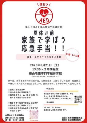周南市の徳山医師会が6月21日(土)、慶万町の徳山医師会病院に隣接する徳山看護専門学校体育館で第18回AED心肺蘇生法講習会「家族で学ぼう応急手当!!」を開く...