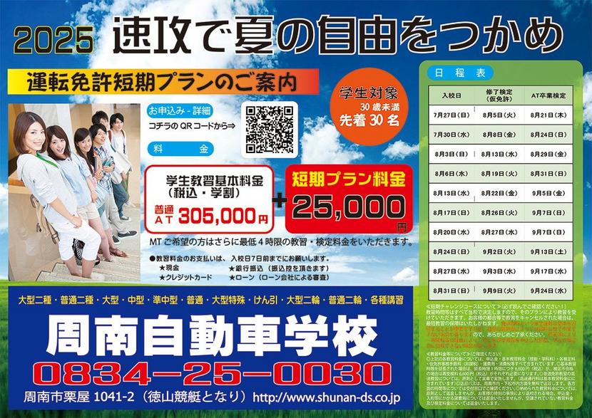 周南市の周南自動車学校は7月27日(日)から入校が始まる学生対象の運転免許短期プランの申し込みを受け付けている。 短期プランは7月27日に入校すれば、8月5日...