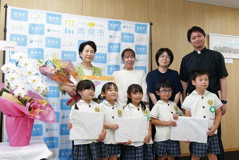 周南市の学校法人みぎわ学園愛光幼稚園(有馬みゆき園長)の園児5人が18日、同市役所を訪れて日頃の感謝を込めて花束や手紙を贈った。 この活動は約160年前にマ...