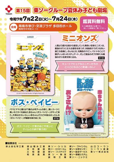 【周南】7月22〜24日・「ミニオンズ」、「ボス・ベイビー」上映 第15回東ソーグループ夏休み子ども劇場