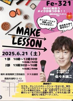 プロのメイクアップアーティスト佐々木誠二さんがメイクを教える「MAKE LESSON」が21日(土)、周南市港町の新南陽鉄工団地組合の3階大会議室で開かれる。...
