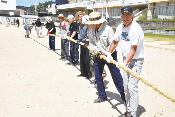 周南市の山﨑八幡宮(河谷和典宮司)で9月28日(日)の秋季例大祭で奉納される本山神事。山車で使う引き綱を作る作業が26日、富田西小のグラウンドであり、毎年この...