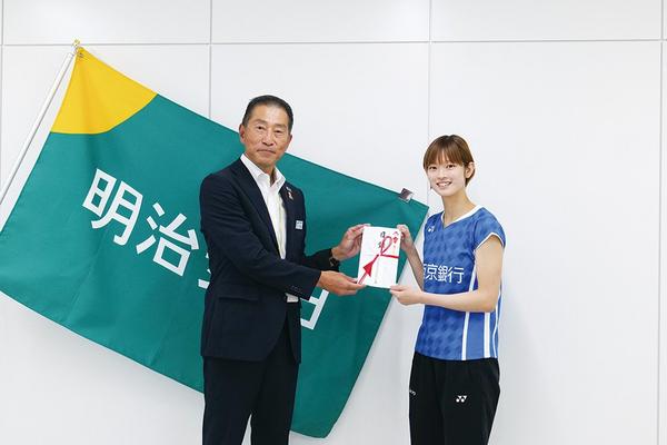 周南市御幸通の明治安田生命保険相互会社徳山支社(川腰藤雄支社長)は「地元アスリート応援プログラム」で西京銀行の実業団バドミントンチームACT SAIKYOの田...
