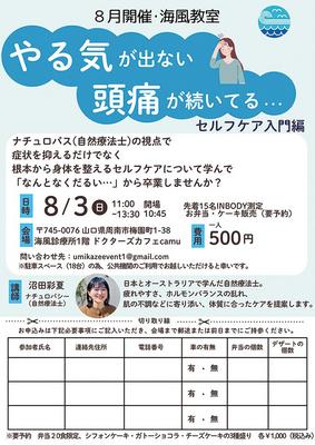 周南市梅園町の海風診療所1階のドクターズカフェcamuで8月3日(日)午前11時から午後1時30分まで、海風教室「セルフケア入門編」が開かれる。 自然療法士...