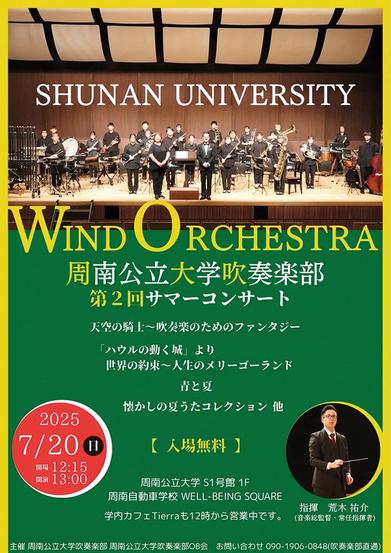 地域周南市周南市の周南公立大(髙田隆学長)の吹奏楽部(東清太郎部長、24人)が20日(日)午後1時から、同大キャンパスの周南自動車学校ウェルビーイングスクエアで「第2回SUMMER CONCERT」を開く。