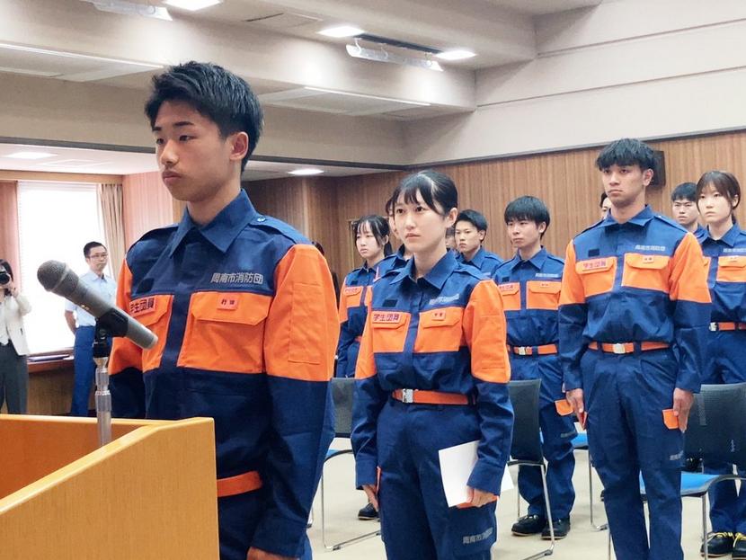 周南市でこのほど、地域防災力を向上しようと周南公立大、徳山高専との連携により、学生消防団員24人の入団が実現した。 11日に同大学本館で辞令交付式が開かれ、...