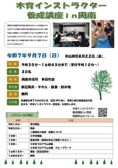 周南市役所多目的室で9月7日(日)、「木育インストラクター養成講座 in 周南」が開かれる。午前9時30分から午後4時45分まで。参加無料。 木育は保育や子...