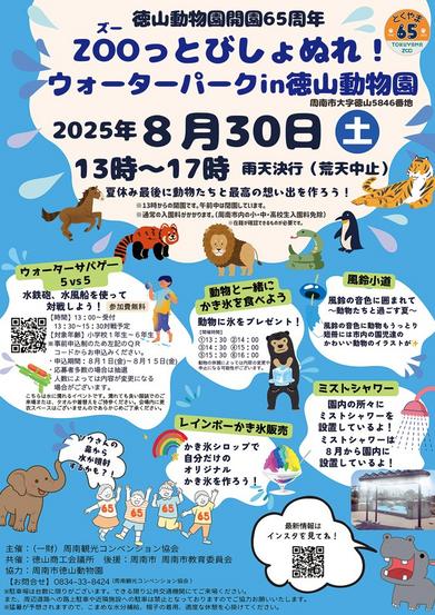 周南市徳山動物園で30日(土)午後1時から「徳山動物園65周年 ZOO(ズー)っとびしょぬれ!ウォーターパーク in 徳山動物園」が開かれる。(一財)周南観光コンベンション協会(中島拓会長)の主催、徳山商工会議所が共催。市、市教育委員会が後援。
