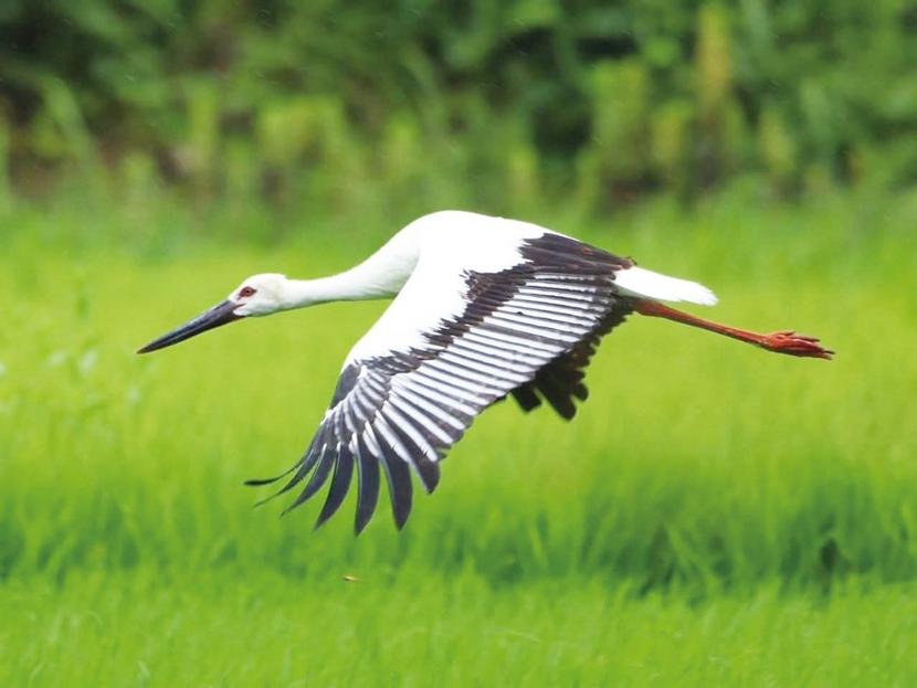 飛び立つコウノトリ(13日・田村勇一さん撮影)
