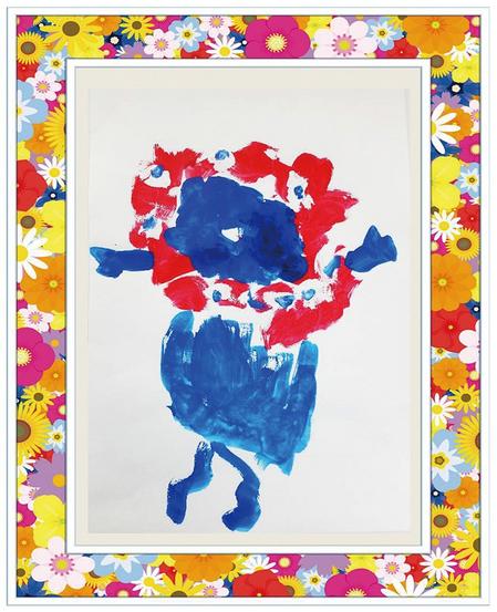 今回の作品は同フェスティバルに応募するため、ミャクミャクのぬいぐるみや絵を見ながら描いたもの。持ちやすいように補助具を付けて太くした筆を使い、赤と青の絵具でミャクミャクを描いた。