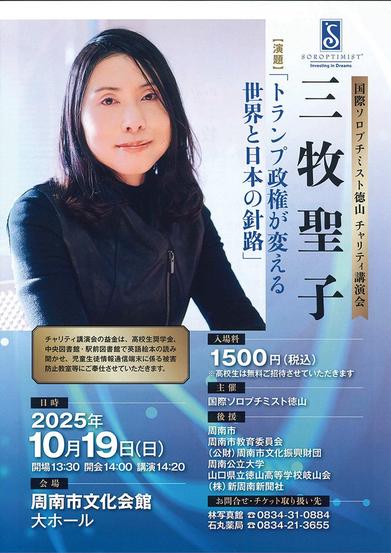 周南市の国際ソロプチミスト徳山(=SI徳山、石丸登紀会長)のチャリティ講演会(新周南新聞社など後援)が、三牧聖子・同志社大学大学院グローバル・スタディーズ研究...