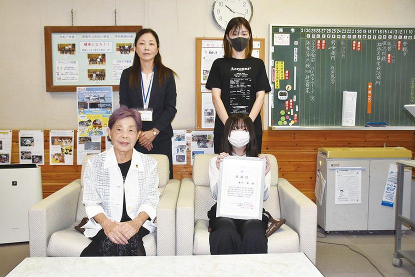 前列左から山田、藤井凛さん、後列左から山本校長、藤井つかささん