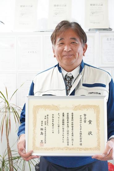 障害者雇用優良事業所として独立行政法人高齢・障害・求職者雇用支援機構理事長努力賞表彰を受賞した周南市三笹町のナカガワシステム㈱(宗村章社長)は、主にコンビナート企業を対象に構内生産物流業務、運送業務などを手掛ける中川産業グループ。