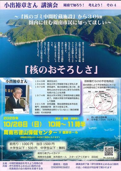 上関町の原子力発電所の使用済燃料中間貯蔵施設から30キロ圏内の周南3市。「核のおそろしさ」を知り、考える講演会が小出裕章さんを講師に迎えて26日(日)午前10...