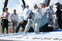 【周南】工事中の古川跨線橋で横断幕制作 富田東小児童「楽しみ」の声
