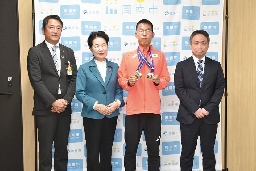 左から河津部長、藤井市長、高山選手、片山室長