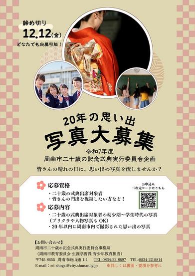 周南市の二十歳の記念式典実行委員会が来年の1月11日(日)に市文化会館で開く「二十歳の記念式典」に合わせ、式典内で実施する企画「二十歳の皆さんと周南市の20年...
