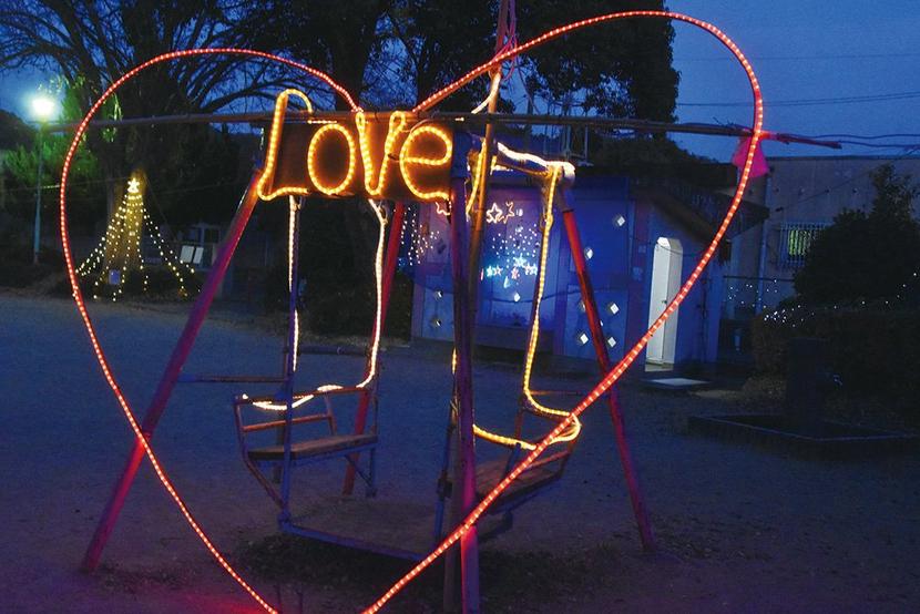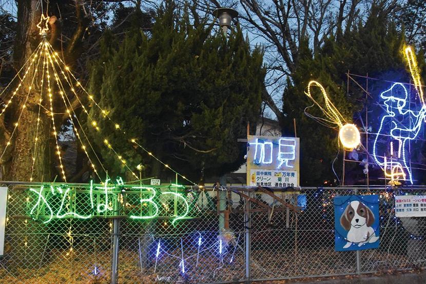 周南市の菊川地区の加見公園で、住民が手づくりしたイルミネーションが輝いている。公園の遊具を利用して、滑り台を使ったゾウや、ベンチ型ブランコのハートなどがあり、...