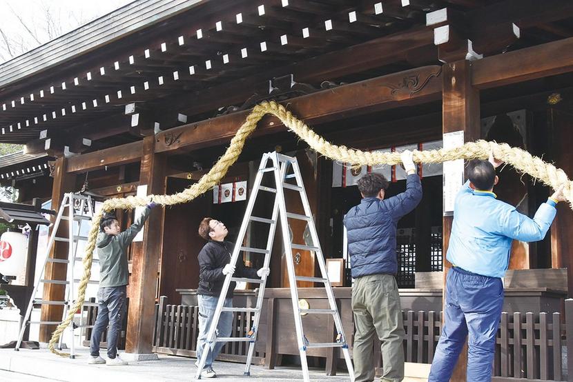 周南市の遠石八幡宮(黒神直大宮司)で14日、社殿の注連縄(しめなわ)が架け替えられた。15本の注連縄は氏子有志や職員が事前に準備した。最も長い拝殿に掲げた注連...