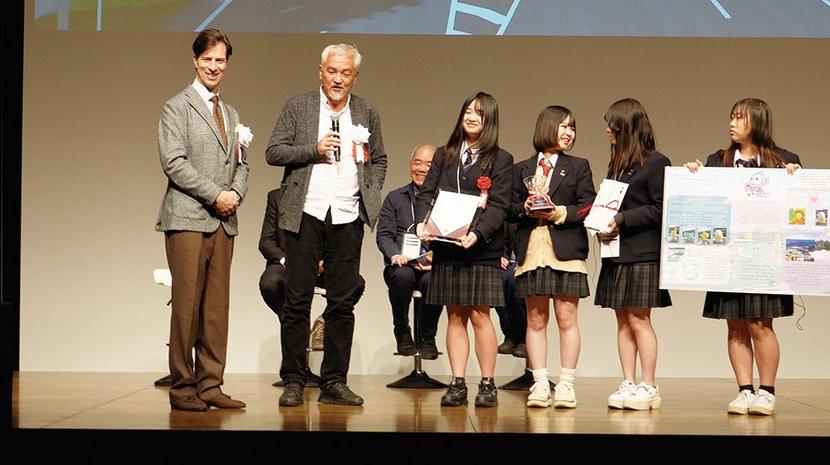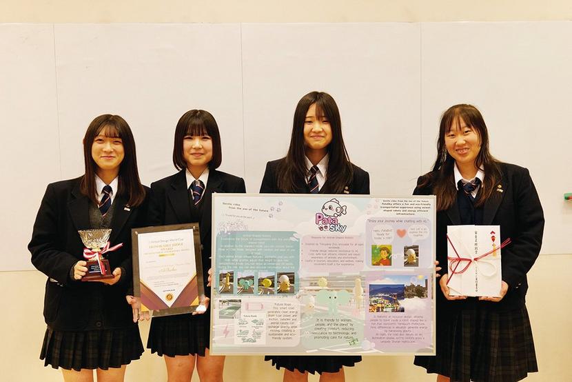 審査員特別賞及びノミネート賞を受賞したのは、これまで大きなコンペに参加したことがなかったことから、身近な題材を扱う世界的コンペに友人同士で参加したという土木建築工学科3年の中川沙羅さん、大島光葉さん、大田和さん、茅原琴海さんの「Patasky」(パタスカイ)。