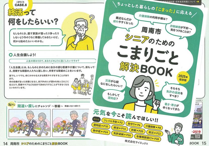 周南市の高齢者に役立ちそうな情報を掲載した「周南市シニアのためのこまりごと解決BOOK」ができた。3,000部を印刷して、市役所や公共施設などで配っている。市...