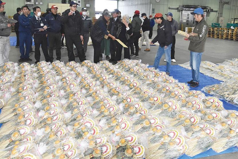 周南市鼓海の地方卸売市場青果市場で25日、「正月お飾り市」が開かれ、床に並べられた玄関飾りを中心に輪飾りなどを次々に競り落としていった。 正月を前にした恒例...