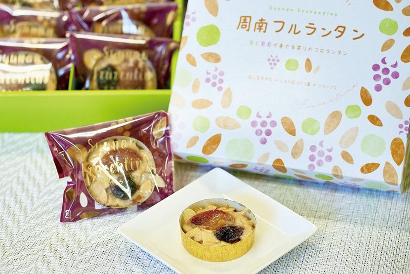 周南フルランタンは須金のフルーツとフロランタンをかけ合わせたお菓子。ナシとブドウを使い、パッケージにもこだわって周南市のお土産にもぴったりな商品に仕上げた。1個280円、8個入り2,592円。