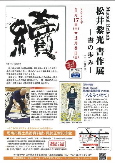 周南市の書家、松井黎光さんの作品を紹介する「書作展―書の歩み―」が17日(土)から3月8日(日)まで、TOSOH PARK永源山の中になる市郷土美術資料館・尾...